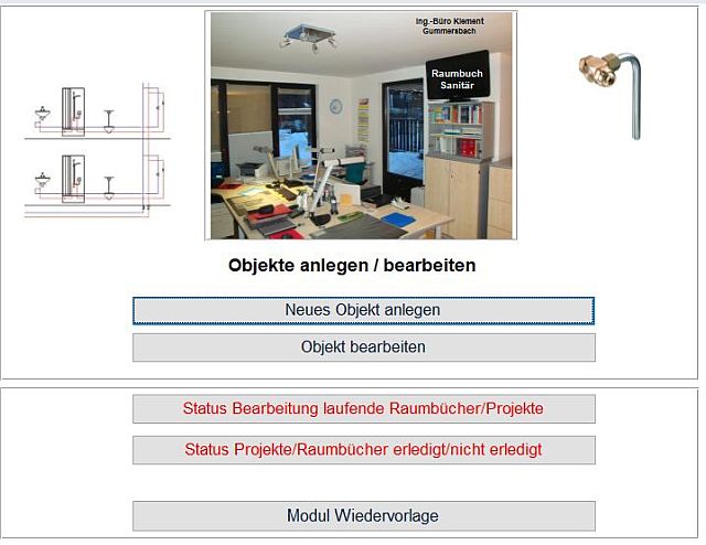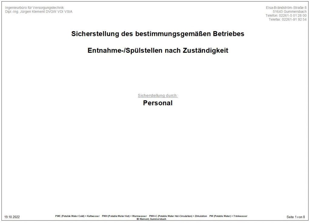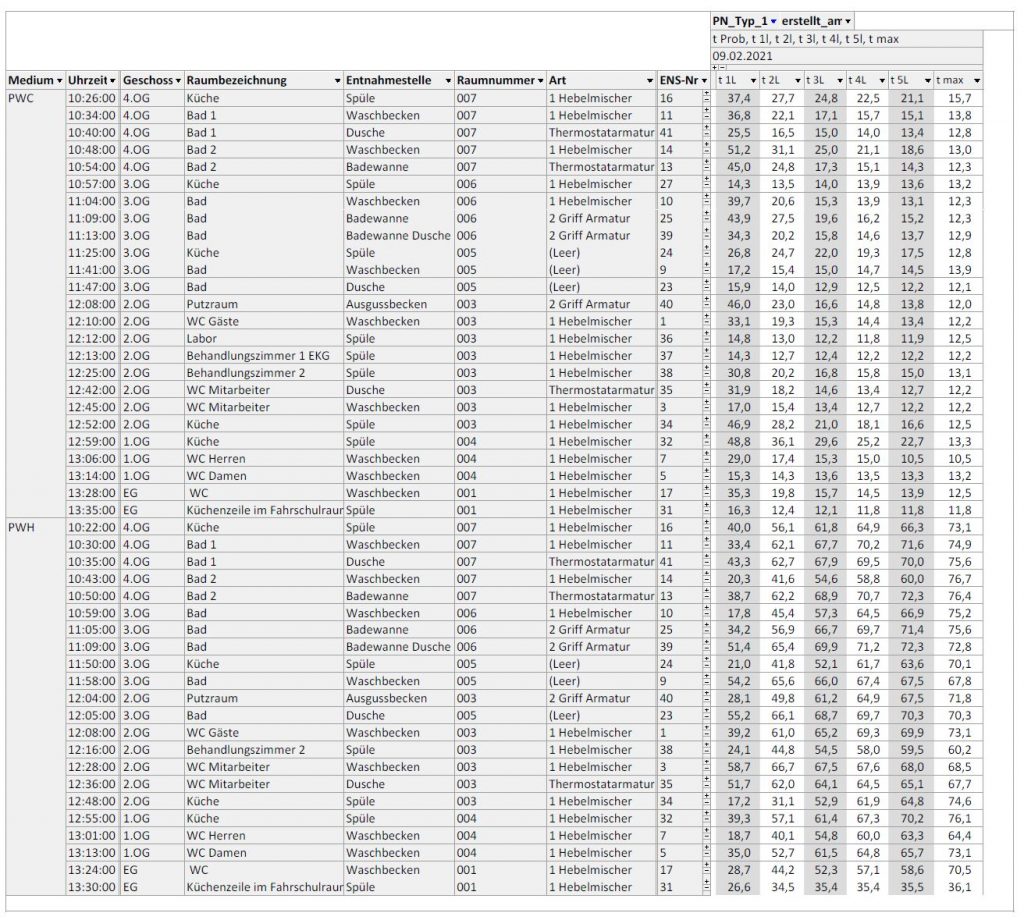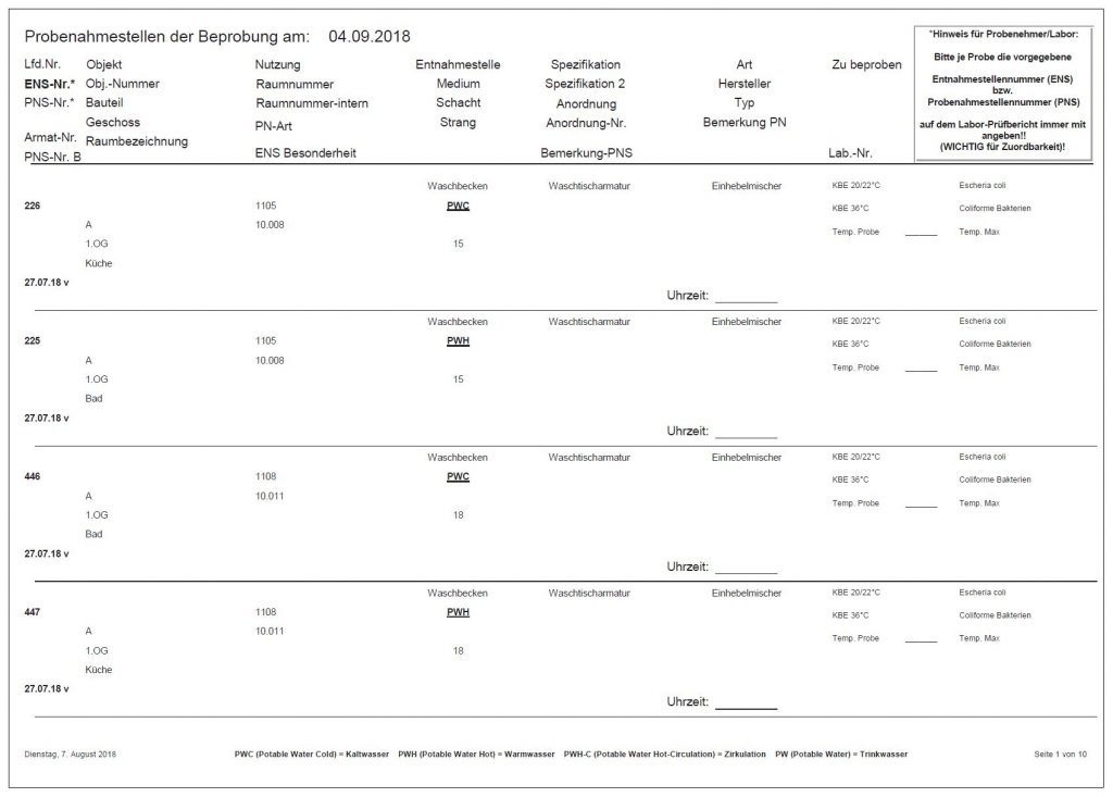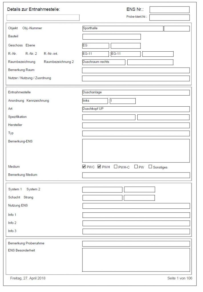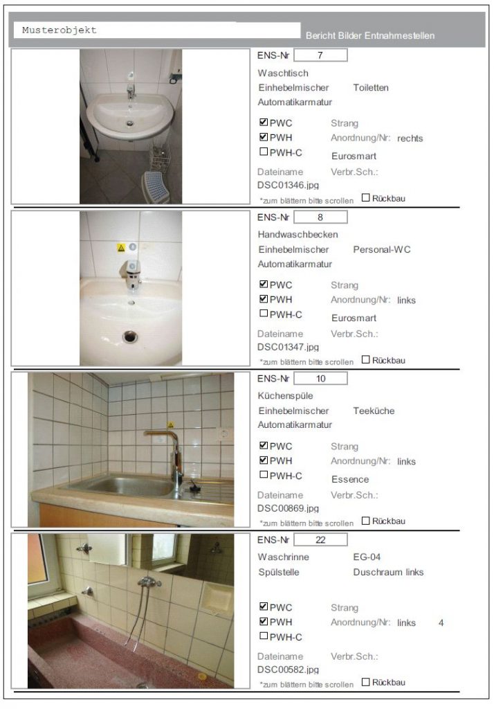 Raumbuch SanitärErfassung/Nummerierung und Klassifizierung von EntnahmestellenErstellung von Spülplänen auf Basis der erfassten EntnahmestellenErstellung von Beprobungen/Beprobungslisten für Trinkwasseruntersuchungen oder TemperaturmessungenErstellung von Auswertungen/Übersichten der BeprobungenFotodokumentation von Entnahmestellen